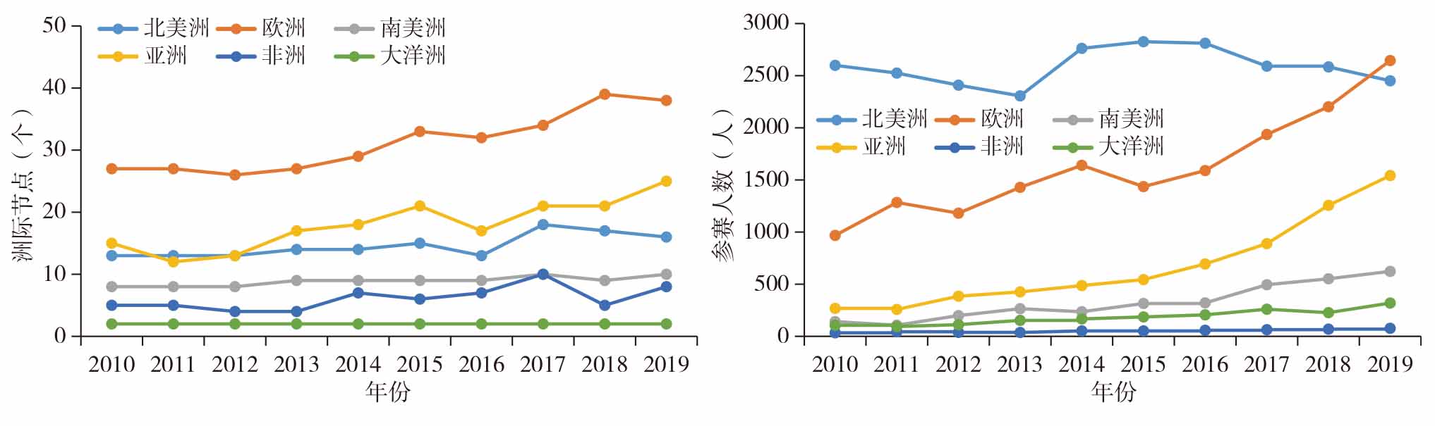 表3 2010—2019年参赛者数量与全球化水平相关性分析Tab.3 Correlation analysis between the number of participants and the globalization level in 2010-2019 |