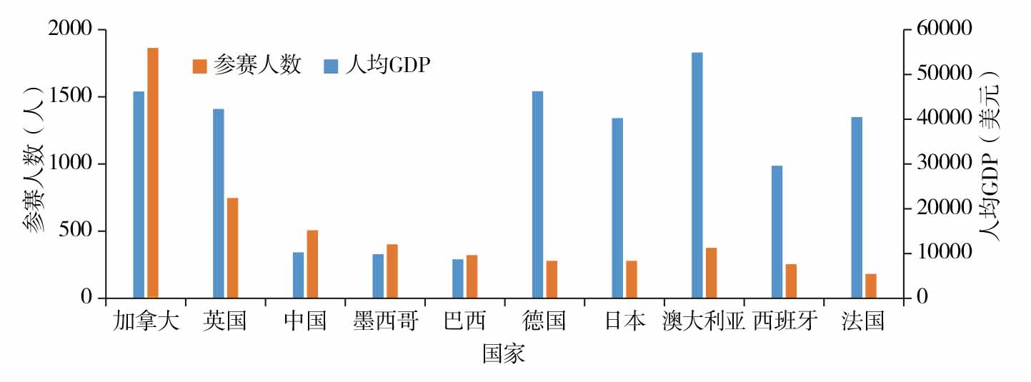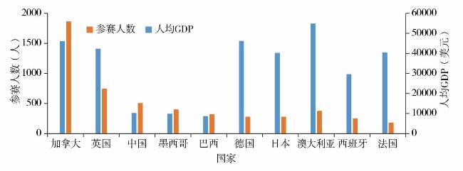 图8 2019年国家人均GDP与波马参赛人数注:数据来自于世界银行数据库(http://data.uis.unesco.org/Index.aspx#)。 Fig.8 National per capita GDP and Boston Marathon participants in 2019 |