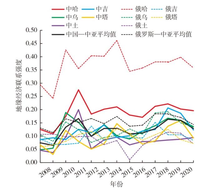 This paper constructs a multidimensional evaluation index of geo-economic linkage intensity,uses the methods of polygon method,vector sum method,and grey relational analysis to comparatively analyze the evolution of geo-economic linkage intensity between China,Russia and Central Asian countries,and its the influencing factors. The results show that: 1) The geo-economic linkage intensity between China and Central Asian countries overall shows a trend of fluctuating growth,while the geo-economic linkage intensity between Russia and Central Asian countries is basically stable. The geo-economic linkage intensity between Russia and Central Asian countries is higher than that of China-Russia. 2) The role of geopolitics in the geo-economic linkages between China,Russia and Central Asian countries has declined,while the role of trade and transportation in the geo-economic linkages between China,Russia and Central Asian countries has risen. The geo-economic linkages between China and Central Asian countries have gradually shifted from being jointly dominated by trade,transportation,and geopolitics to being jointly dominated by trade and investment,while the geo-economic linkages between Russia and Central Asian countries have shifted from being jointly dominated by tourism,trade,and geopolitics to being jointly dominated by trade,tourism,and transportation. 3) The geo-economic linkage intensities of China-Central Asian countries and Russia-Central Asian countries both show the pattern which is higher in north of Central Asia and lower in the south of Central Asia,but the geo-economic linkage intensities between Russia and the four countries in the south of Kazakhstan fluctuate greatly. 4) Resource endowment is a common and important driving force for the evolution of the geo-economic linkage intensity between China,Russia and Central Asian countries. The geo-economic linkages between China and Central Asian countries are more dependent on market size compared with Russia,and the geo-economic linkages between Russia and Central Asian countries are more sensitive to the level of economic development and political stability than that of China.