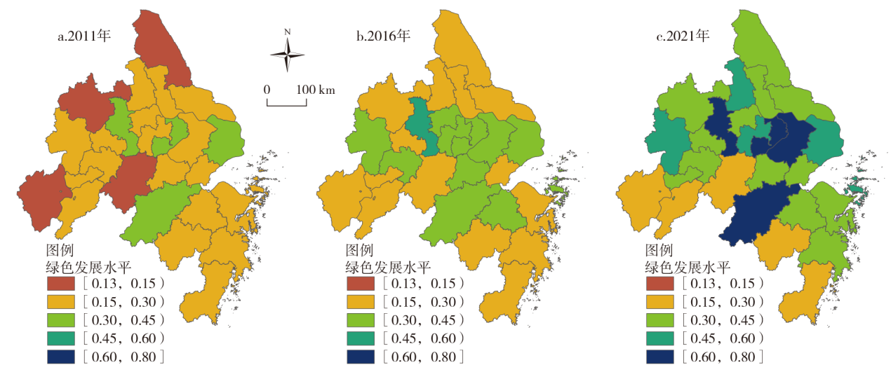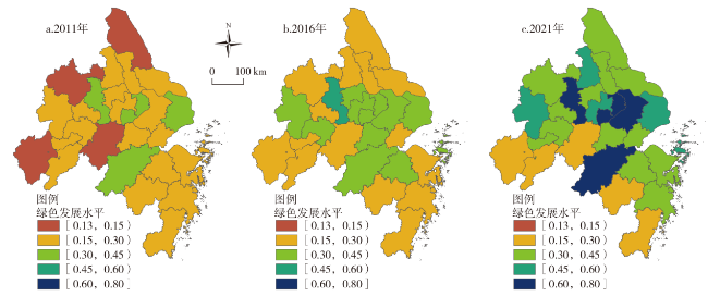 图1 2011—2021年长三角城市群绿色发展水平的时空演化趋势Fig.1 Evolution trend of green development level in the Yangtze River Delta urban agglomeration,2011-2021 |