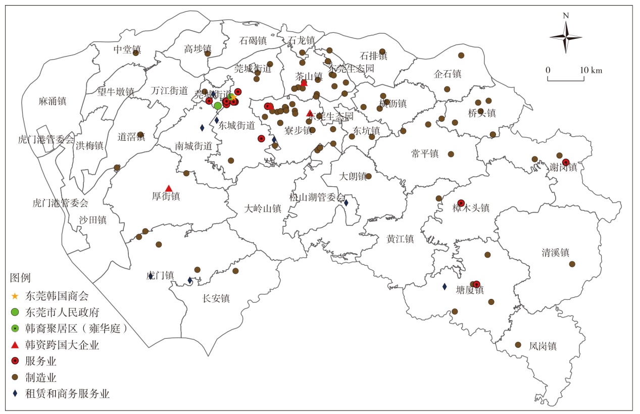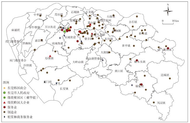 图2 东莞市韩国人创业空间的分布特征Fig.2 Distribution characteristics of Korean entrepreneurial spaces in Dongguan City |