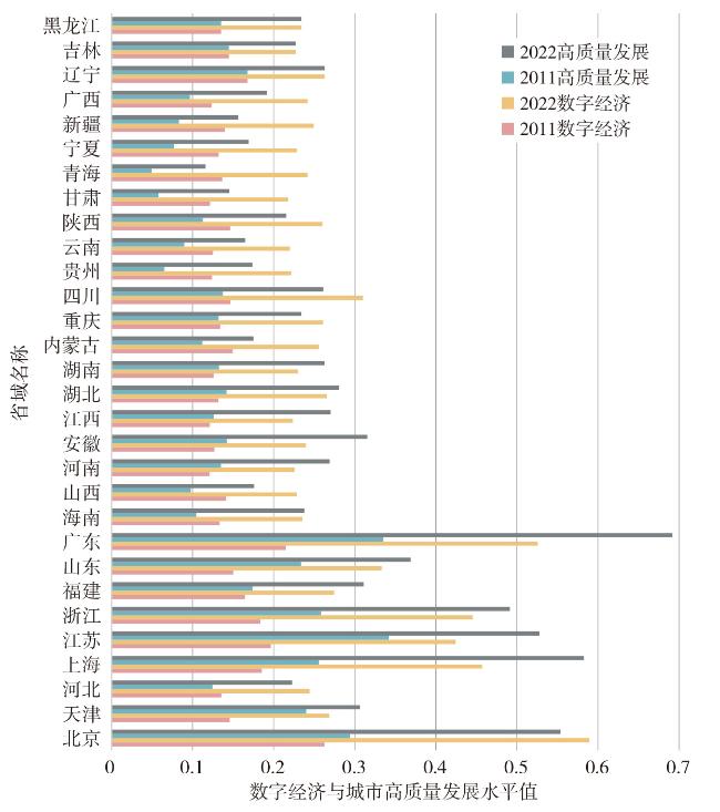 Based on the data of 30 provincial-level regions in China from 2011 to 2022,this paper explains the theoretical concept of high-quality urban development from the perspectives of innovation,coordination,green,openness,and sharing,and measures the comprehensive level of high-quality urban development and the level of digital economy development from the perspectives of the internet,informatization,digital industry. It explores the mechanism and effect of digital economy empowering high-quality development of Chinese cities through empirical examination. The results are as follows: 1) The development trends of digital economy and high-quality urban development are generally good. The digital economy development is higher in the eastern region than that in the western region,followed by the northeastern region and the central region,while the level of high-quality urban development decreases from the east of China to the west of China. 2) This paper shows that the digital economy significantly promotes high-quality urban development,with every 1 unit increase in the level of digital economy development leading to a 0.575 unit increase in high-quality urban development. This conclusion remains valid even after considering a series of robustness tests. 3) This paper highlights the mediating role of factors such as optimal allocation, industrial structure advancement,and technological progress in the process of high-quality urban development empowered by the digital economy. 4) In order to give full play to the economic effect of the development of digital economy and improve the level of high-quality urban development,it puts forward some measures and suggestions that are improving the level of digital economy development to narrow the regional development gap,improving the allocation accuracy and utilization efficiency of urban land elements in the digital economy development,and strengthening the empowering effect of digital economy in the high-quality urban development.