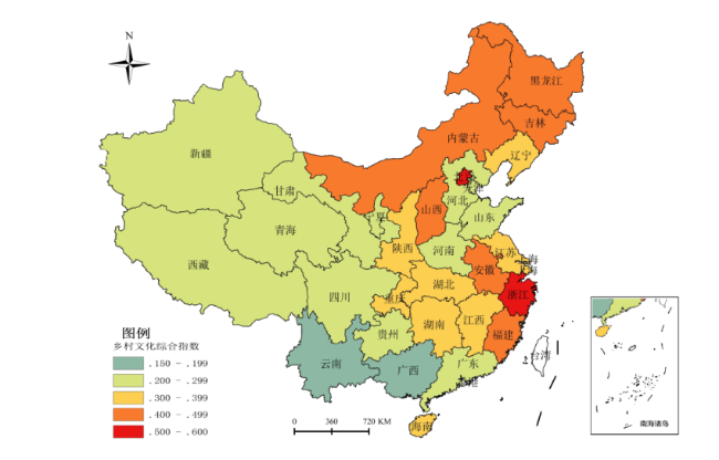 通过农业现代化指数和乡村文化发展指数,基于耦合协调模型,分析中国农业现代化与乡村文化之间的耦合协调及空间分布关系,最终根据2016年中国5种乡村文化子指标和5种农业现代化子指标,计算得出各省市的乡村文化综合指数和农业现代化综合指数,进而计算出各自这两种系统之间的耦合度和协调度、分析各自的分布特征。结果表明总体乡村文化发展指数低于农业现代化指数,农村文化生活发展滞后;全国主要地区农业现代化与乡村文化发展处于高度协调、较高的耦合关系,但是个别地区的协调度和耦合度较低;这两个系统的发展程度与经济总体发达程度空间分布保持较高的一致性,即东部地区各种指数较高,而西部各种指数较低。