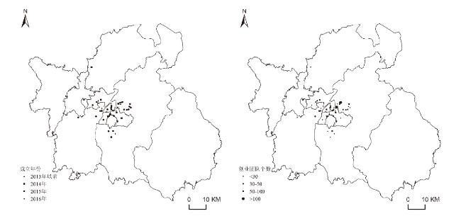 图2 南昌众创空间空间分布与时空演化注:根据南昌市科技局数据绘制;地址不详的众创空间不包括在图中;底图来源为南昌市自然资源局。 Fig.2 The spatial distribution and spatio-temporal evolution of shared work spaces in Nanchang |