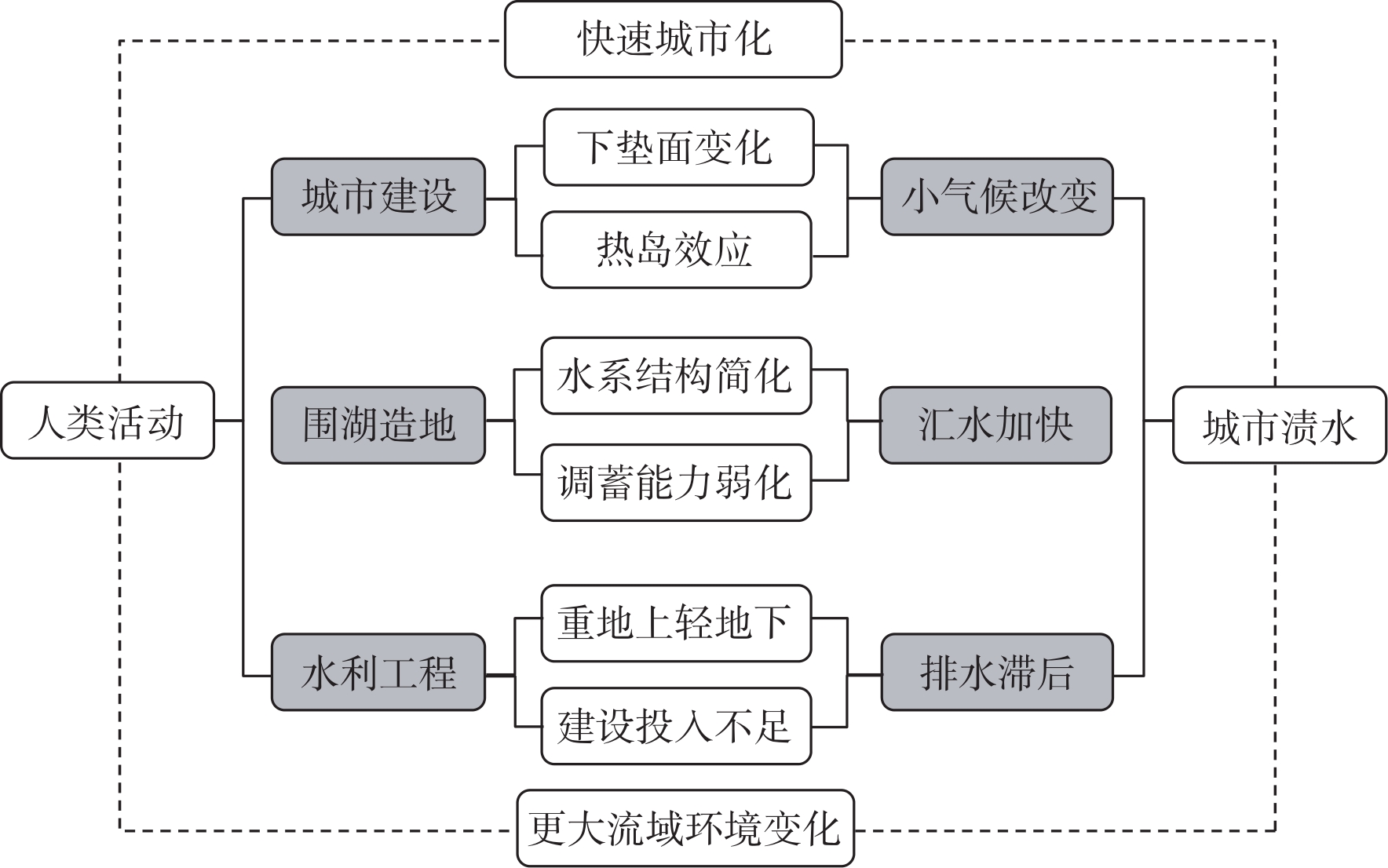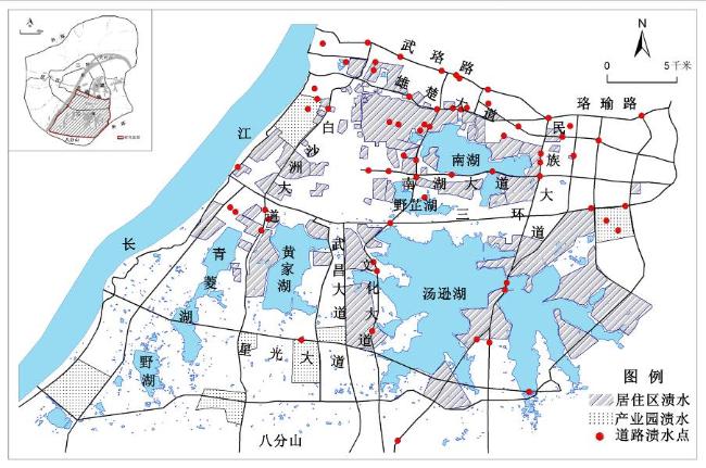 随着城市化进程的加快和社会经济的发展,城市内涝已成为继人口拥挤、交通拥堵、环境污染等问题之后的又一大城市病。武汉是我国内涝频发的城市之一,尤其是2016年夏季发生的城市内涝造成了巨大的社会经济损失。文章以武汉中心城区汤逊湖水系为研究范围,利用最邻近指数法、核密度强度分析法、湖泊变化强度指数等方法,探讨2016年6月30日—7月6日期间城市内涝灾害发生最严重时段的渍水特征,并揭示其形成原因和发生机制。研究发现:①城市暴雨渍水类型多样,主要包括居住区渍水、道路渍水和产业园区渍水三类。②渍水点呈现明显的空间集聚特征:渍水点以湖泊为中心集中分布,围湖造地区域是渍水发生的重灾区,城市新开发区和在建施工区也是渍水发生的集中区域,水系中下游比上游渍水严重。③湖泊容量萎缩、水系结构简化、水利建设滞后、汇水强度增大、异常气候突发等共同导致暴雨渍水灾害的发生。