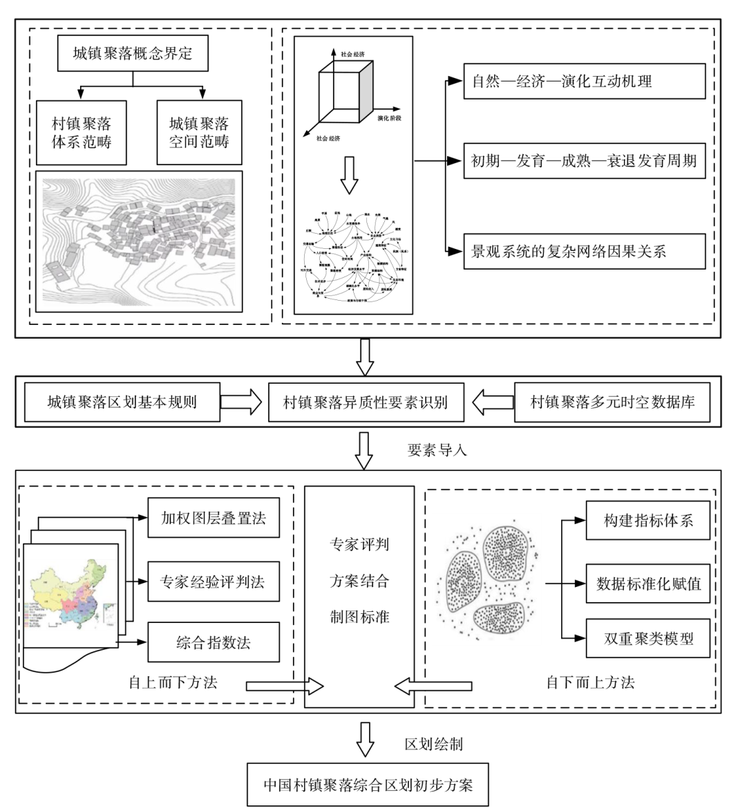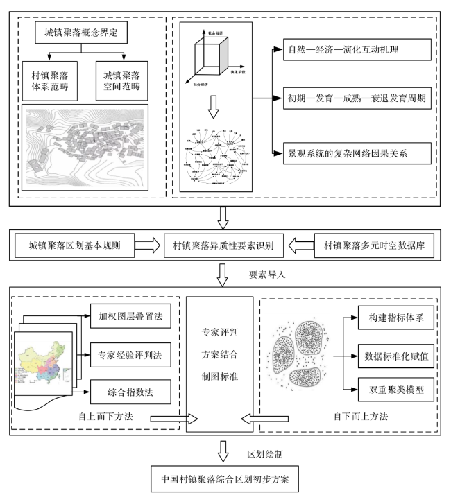Village and town settlements are a complex natural-human landscape system under specific geographical conditions,which has been affected by long-term natural,economic,social and cultural factors,and has significant regional differences and similarities. Based on the reality situation of village and town settlements in China,this paper combs and defines the concept and spatial scope boundary of village and town settlements,and identifies the spatial differentiation elements of village and town settlements. And based on the existing zoning results,this article takes the topography,climate,resource endowment,regional culture, external driving force,population,economy and industry and other factors as the basis for division,and adopts a zoning idea that combines top-down and bottom-up. Based on spatial-attribute double clustering method,comprehensive index method and expert experience evaluation,it divides China into 5 large regions of village and town settlements,12 regions of village and town settlements and 48 sub-regions of village and town settlements. There are different natural attributes, economic attributes,social attributes,cultural attributes and development stages among the big regions,regions and sub-regions of the villages and towns settlements,which embodies the law of regional differentiation of the village and town settlements at the national level. Through the study on the concept,identification and division of villages and towns,these can not only promote the interdisciplinary application and development in the field of villages and towns, but also provide basic scientific support for promoting the construction and planning management of villages and towns to meet the strategic needs of national rural revitalization.