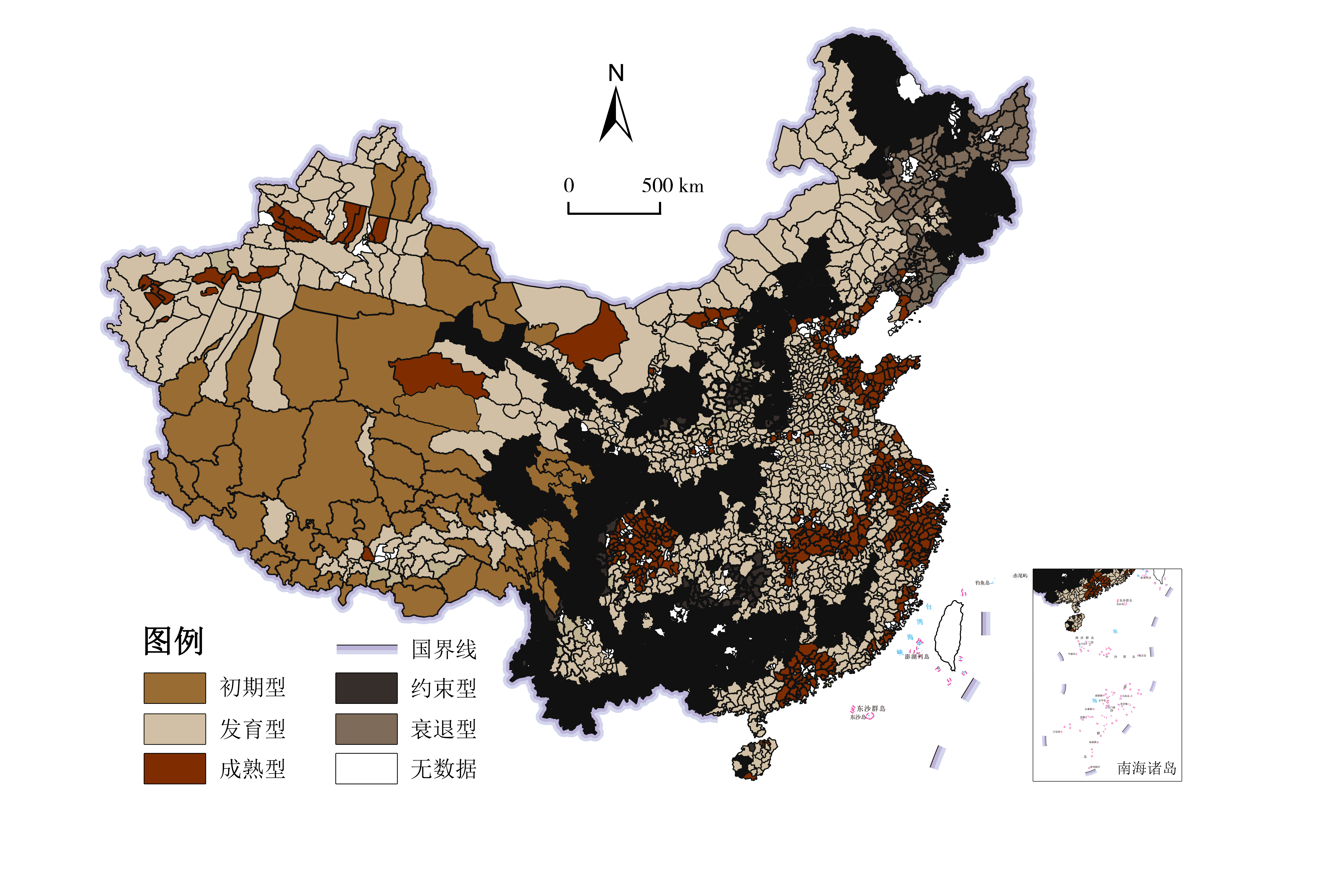 图6 中国村镇聚落发展演化空间格局Fig.6 Spatial pattern of development and evolution of village and town settlements in China |