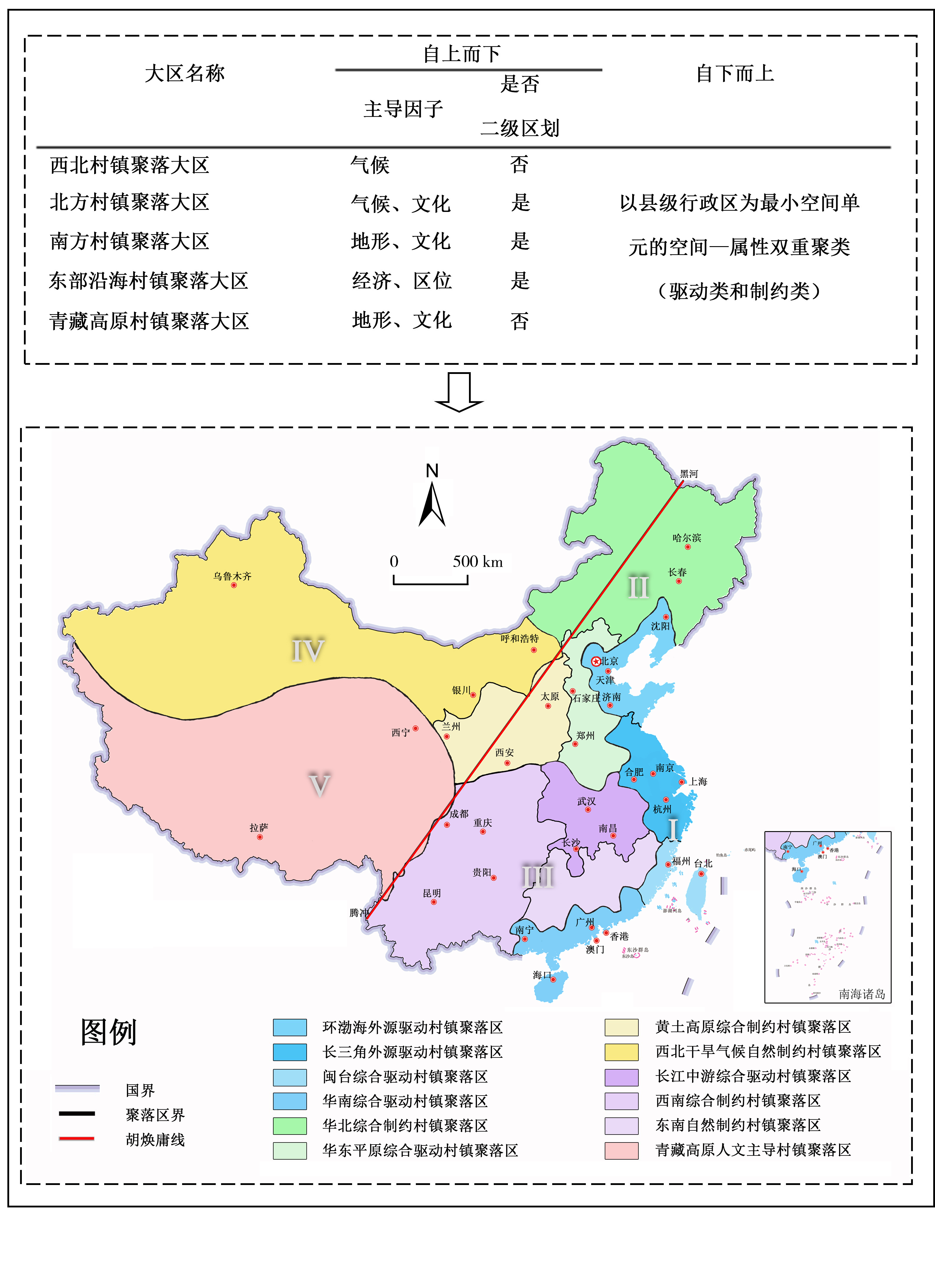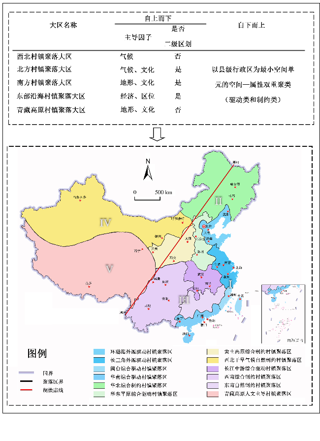 村镇聚落是在特定的地理条件下,经过长期的自然、经济和社会文化等多种因素共同作用的复杂自然—人文景观系统,具有显著的地域分异性和相似性。文章基于中国村镇聚落的发展现实,梳理并界定村镇聚落的概念和空间范围,识别村镇聚落空间分异要素。在借鉴已有区划成果的基础上,以地形地貌、气候、资源禀赋、地域文化、外部驱动力、人口、经济和产业等要素为划分依据,采用自上而下与自下而上相结合的区划思路,运用空间—属性双重聚类法、综合指数法和专家经验评判,将中国划分为5个村镇聚落大区、12个村镇聚落区和 48个村镇聚落亚区。各个村镇聚落大区、区和亚区之间呈现出不同的自然属性、经济属性、社会属性、文化属性和发展阶段特征,体现了村镇聚落在全国层面的地域分异规律。通过对村镇聚落概念、识别和区划的研究,不仅能够推动村镇领域的交叉学科应用与发展,还为面向国家乡村振兴战略需求提升村镇建设和规划管理提供基础性的科学支撑。