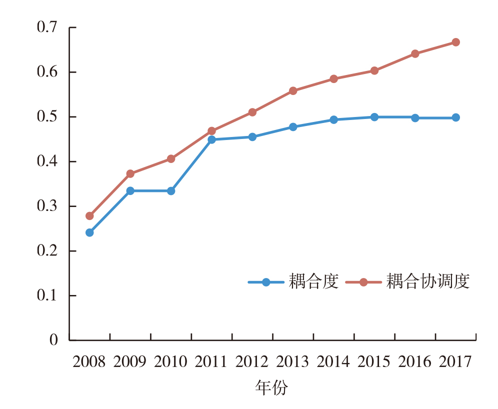 耦合协调度 | 0.2784 | 0.3729 | 0.4062 | 0.4685 | 0.5103 | 0.5582 | 0.5849 | 0.6033 | 0.6411 | 0.6670 |