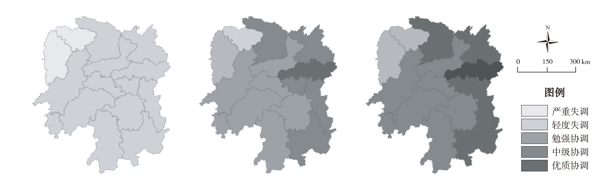 协调程度 | 中度失调 | 轻度失调 | 濒临失调 | 濒临失调 | 勉强协调 | 勉强协调 | 勉强协调 | 初级协调 | 初级协调 | 初级协调 |