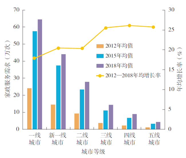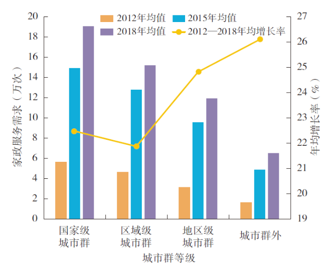 图4 2012—2018年中国不同等级城市群家政服务需求均值及其增长率Fig.4 Average demand and growth rate of domestic service in different level urban agglomerations in China from 2012 to 2018 |