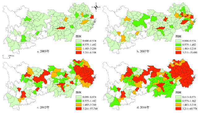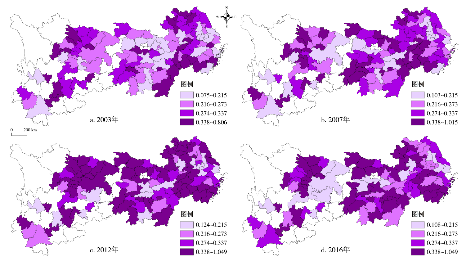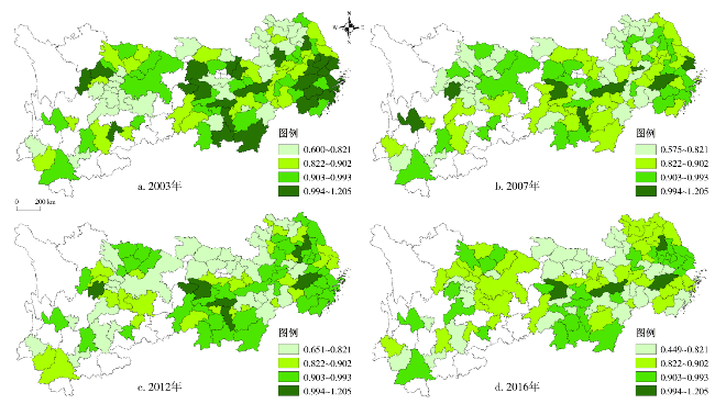 表2 长江经济带城市群创新产出的空间自相关检验Tab.2 Spatial autocorrelation test of innovation output in urban agglomerations along the Yangtze River Economic Belt |