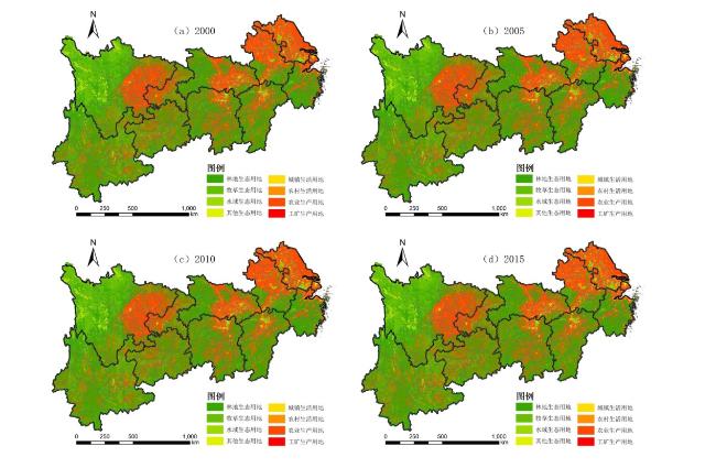 图1 2000—2015年长江经济带三生用地分布图Fig.1 Distribution of ecological-living-productive land in YREB during 2000-2015 |