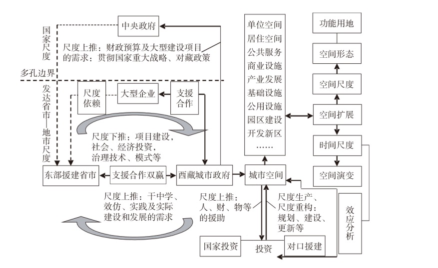 The anti-gradient and leapfrog development strategy in Shigatse's urban development is the core national strength. This paper discusses the similar and different effects of state investment and counterpart aiding to the urban development and urban spatial expansion in Shigatse. The objective explores the procedure related scale production of People's Republic of China (PRC), developed provinces (prefecture) and local government in Tibetan urban development and city spatial expansion. Based on scale theory, the qualitative research method, mathematical statistics technology and GIS spatial analysis are used to seek for the characteristics, evolution features and governance models. The results show that: 1) After the year of 1995, urban space began to expand rapidly. From 2005 to 2014, the variable quantity and rate of urban spatial expansion are the largest. The urban spatial structure and function are gradually optimized and improved. Resident and public service facilities are the dominant property. In 2014, industrial functions exceed public service facilities uses. In the year of 2015 to 2016, urban spatial development is turning to internal renewal and green development strategy. 2) The assistant investment of state and developed provinces all promotes the economic development and urban spatial expansion. The urban developed and spatial evolutional effects of national investment are greater than what coming from developed provinces assistant investment to Tibet. 3) The Central government, developed provinces in middle and eastern China and Tibetan local government apply scale production forming two kinds of governance model: vertical governance model and coordinate governance style. Meanwhile, the vertical governance model is defined as three hierarchical scales: Central government-China developed prefectural provinces government-Tibetan local government. Coordinate governance model is consists of four levels about the Central government-China developed provinces government- Central enterprise-Local government. 4) At the socialist planned economic time, the governance political scale is two level of central-local government. The constructive aspects in residential space, public service facilities and infrastructure boost urban spatial expansion and urban land use structure variation. 5) At the reform and opening period, it is concluded that the three level political governance of state government-developed provinces government-local government. The state investment and counterpart construction from developed areas jointly furthers urban construction. Counterpart assistance to the urban spatial expansion is a strengthening process.