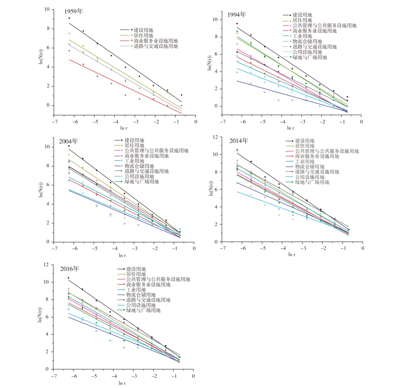 图4 建设用地及各功能用地的lnr与ln(N(r))双对数的幂函数拟合结果Fig.4 Power function fitting results of lnr and ln(N(r)) about construction land and kinds of functional lands |