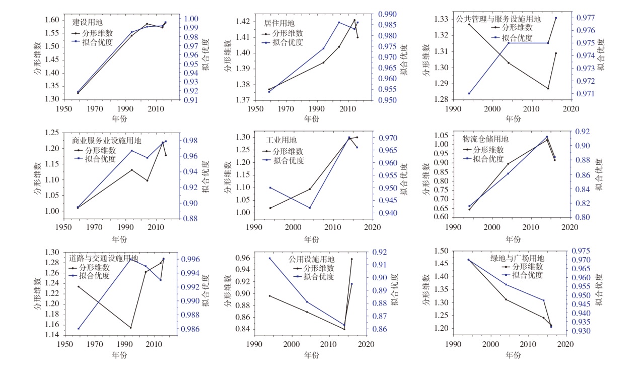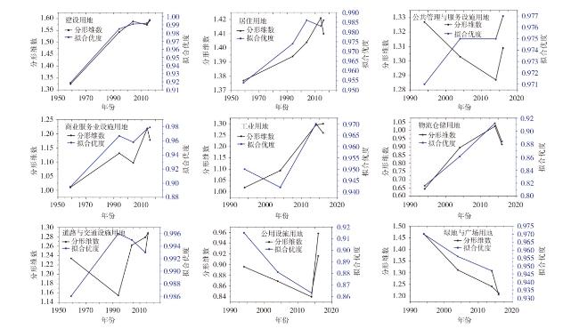 表4 日喀则市城市建设用地及其各土地利用类型的分形特征统计(1959—2016年)Tab.4 Statistics on the fractal characteristics of urban construction land and its land use types in Shigatse city(1959-2016) |