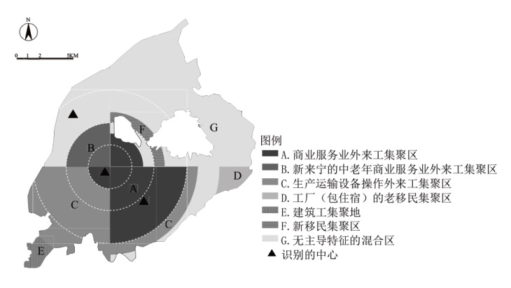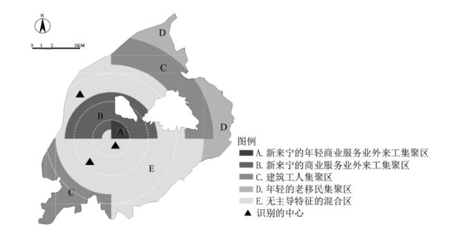A | 商业服务业农民工集聚区 | 0.14 | -1.22 | -0.02 | 0.68 | 商业服务业农民工和个体工商户占比高 | 中心区大部分地区和东南区域的内城和近郊 |