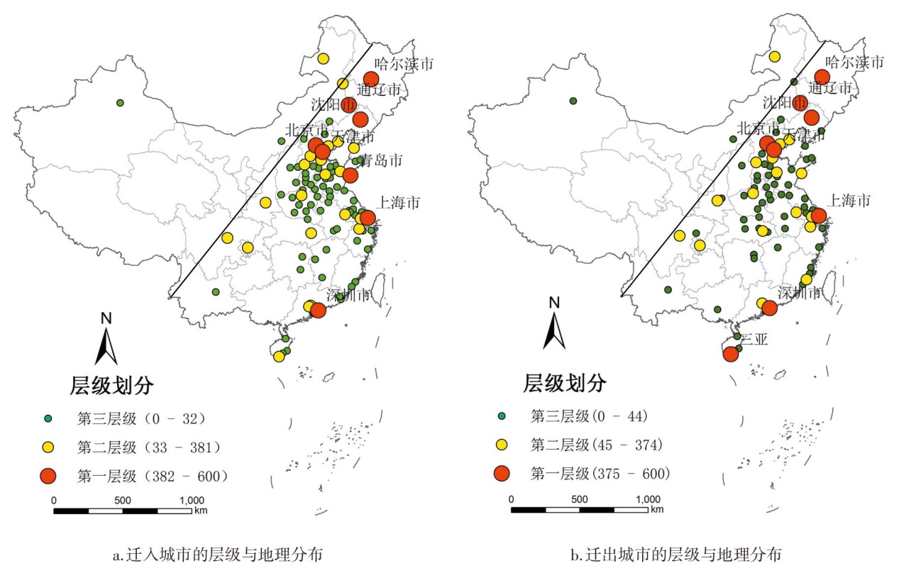基于2015年春运期间长春市与省外城市的人口迁移数据,结合GIS空间表达、自然断裂法、等级钟等方法,分析长春市人口流动的层级特征、空间格局、时序特征及动力机制。研究表明:①春运期间其他城市与长春市间的人口流动具有明显的层级特征,高层级城市的组成遵循拉文斯坦的经济律,低层级城市的空间布局遵循距离律。②长春春运人口流动高度集中于“胡焕庸线”以东区域,其中长春人口联系的重点区域集中于京津冀与长三角地区且分布形态呈现出金字塔式层级分布结构。③春节前后人口流动存在差异,节前迁移城市集中化,节后迁移城市多样化和分散化。④经济律和距离律在人口迁移中起核心作用,而地理认同、适应性及部分特殊城市的特殊职能对迁移方向也存在明显影响。⑤长春市承担吉林省人口流出的门户功能。⑥百度迁徙数据在人口流动研究中具有很好的表征作用,但仍然存在偏向和缺乏个体信息等固有缺陷。
