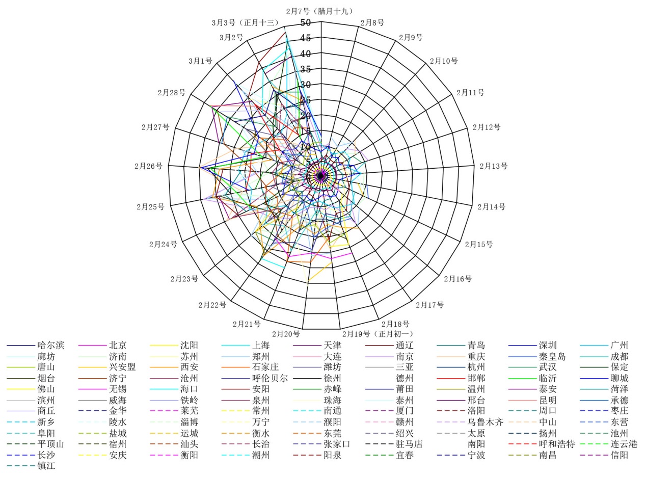第三层级 | 烟台、济宁、邯郸、德州、徐州、临沂、聊城、莆田、泉州、赤峰、无锡、温州、菏泽、海口、安阳、珠海、泰安、威海、铁岭、泰州、滨州、邢台、商丘、厦门、南通、莱芜、昆明、金华、赣州、承德、常州、淄博、周口、中山、枣庄、新乡、万宁、濮阳、洛阳、陵水、衡水、驻马店、镇江、长治、长沙、张家口、运城、宜春、阳泉、扬州、盐城、宿州、信阳、乌鲁木齐、太原、绍兴、汕头、平顶山、宁波、南阳、南昌、连云港、呼和浩特、衡阳、阜阳、东营、东莞、池州、潮州、安庆 | 赤峰、兴安盟、潍坊、佛山、大连、保定、厦门、德州、铁岭、烟台、万宁、莆田、昆明、菏泽、安庆、济宁、徐州、承德、无锡、邯郸、海口、长沙、宁波、聊城、南昌、临沂、驻马店、珠海、温州、泰安、周口、宿迁、新乡、孝感、湘潭、乌鲁木齐、商丘、陵水、福州、盐城、信阳、襄阳、咸阳、渭南、威海、泰州、太原、台北、南通、南宁、南充、洛阳、荆门、嘉兴、黄冈、呼和浩特、衡水、合肥、毫州、丹东、常州、安阳 |