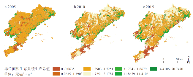 表5 大连市2005、2010和2015年不同用地类型生态系统生产总值核算结果(108元·a-1)Tab.5 Dalian’s different land use types’ per unit area GEP in 2005,2010 and 2015 |