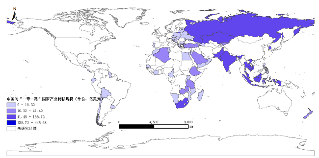 图2 2017年中国向“一带一路”沿线国家产业转移规模空间分布Fig.2 Spatial distribution of the scale of industrial transfer from China to the Belt and Road countries in 2017 |