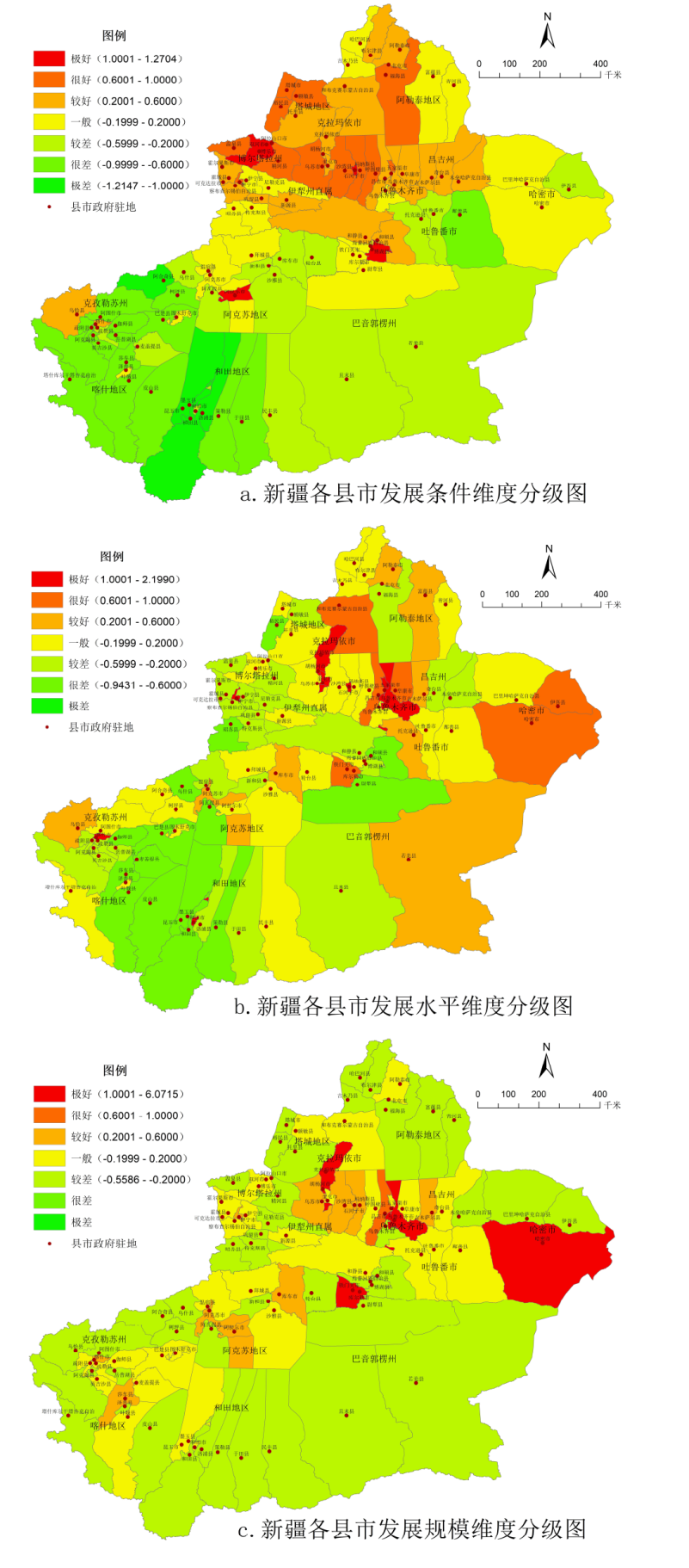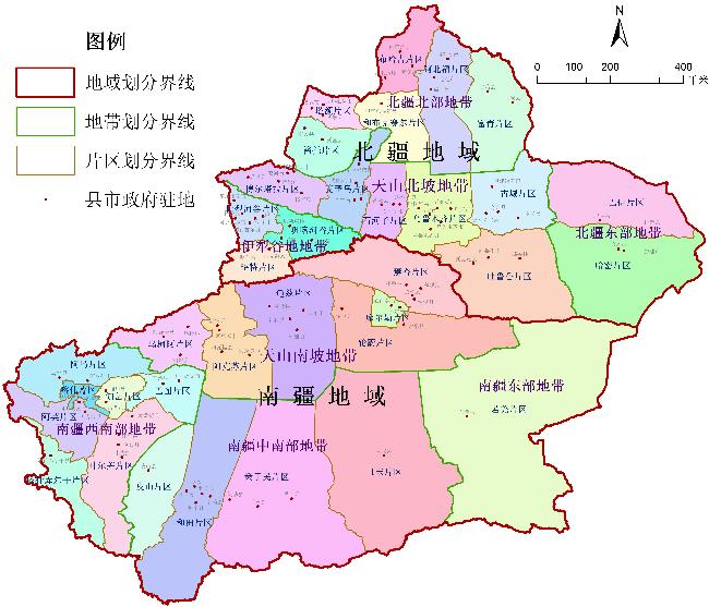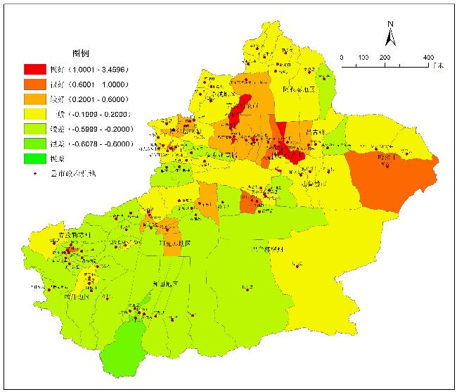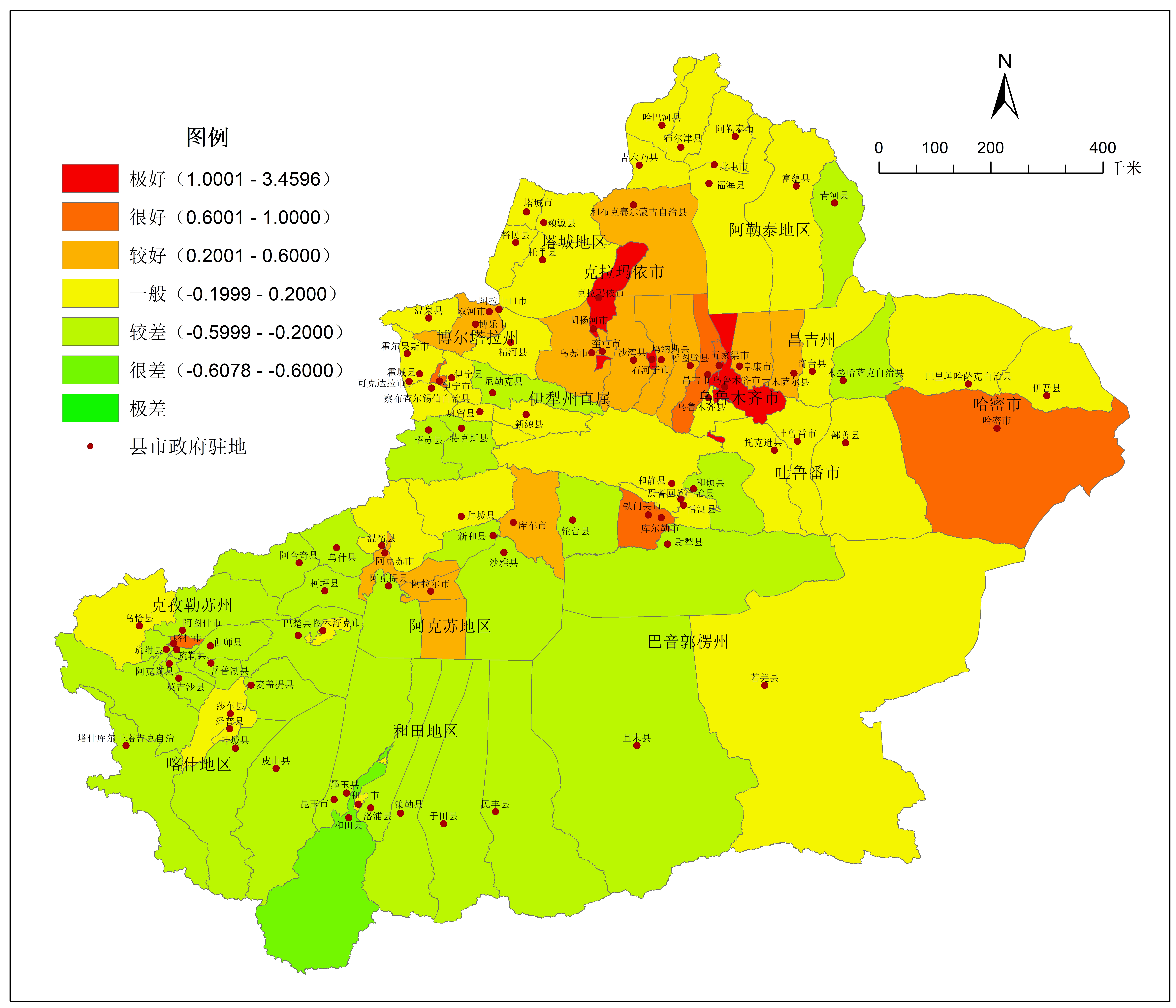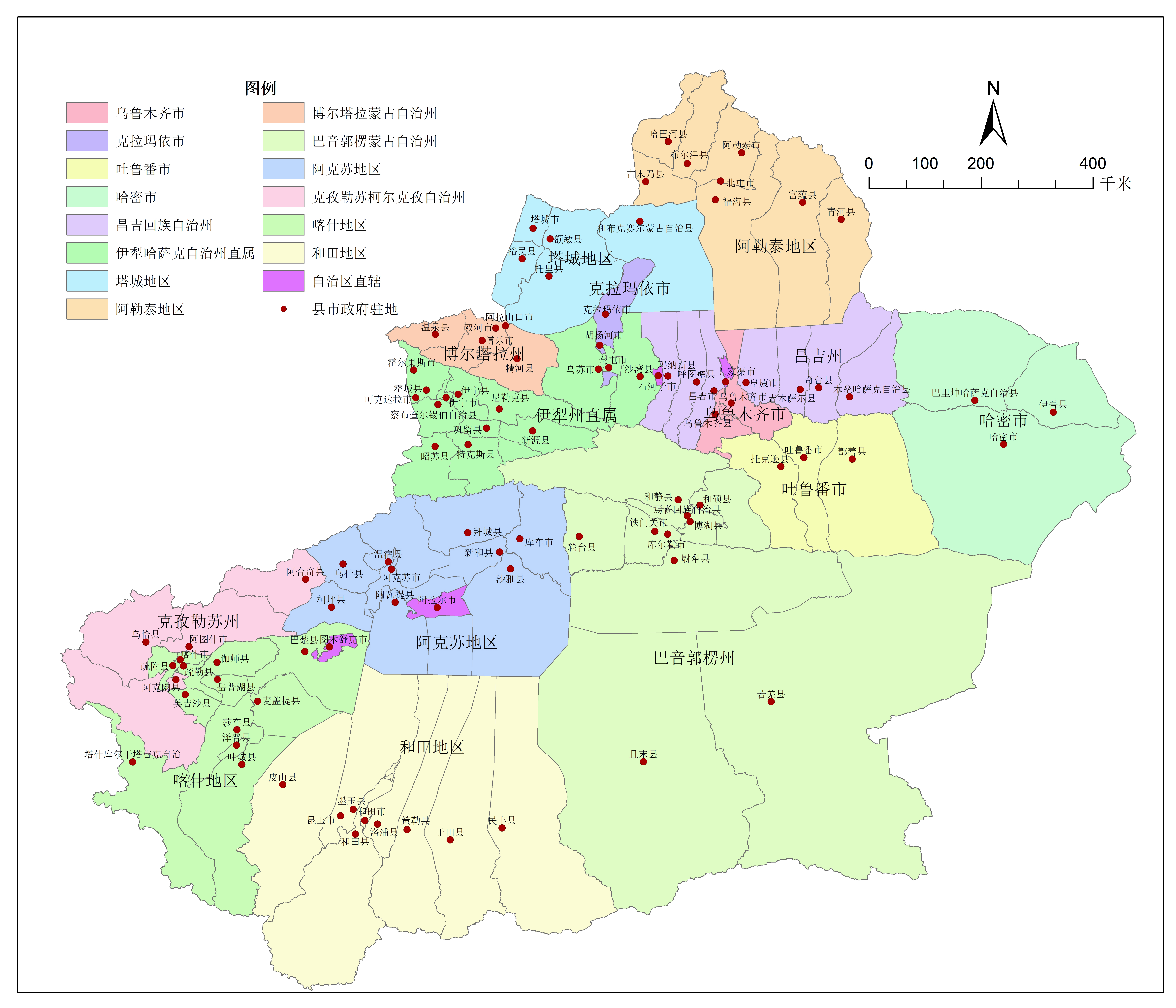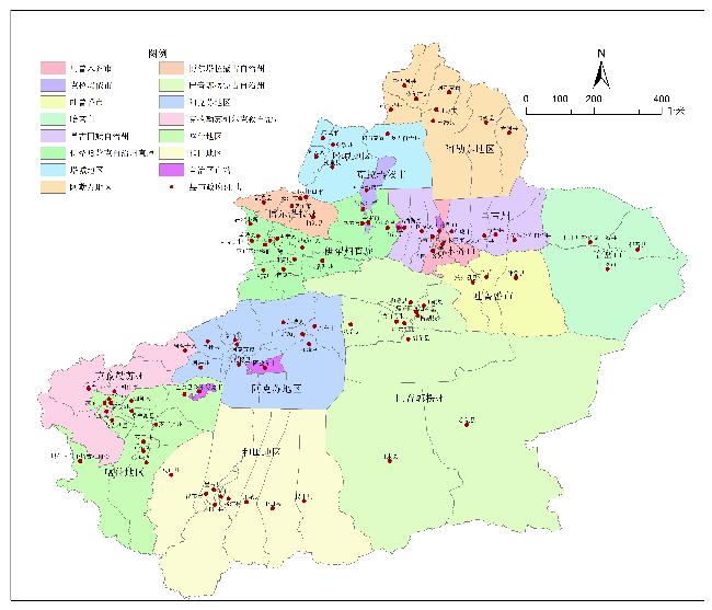 图1 新疆行政区划图注:全疆106个县级政区中,北屯、铁门关、阿拉山口、双河、霍尔果斯、昆玉、胡杨河8个市由于成立较晚缺乏数据原因而未能纳入该图(图中仅标出其政府驻地而未明确行政界线),乌鲁木齐所辖7个区、克拉玛依所辖4个区分别被视为一体而合并,伊州区、高昌区分别由哈密市、吐鲁番市代指,由此共有89个县市单元纳入该图。本文随后的指标计算和制图分析都以这89个县市为基本单元,但为避免遗漏而在最终区划方案中根据可获取的部分数据资料均将前述8个市纳入其中。 Fig.1 The administrative district of Xinjiang Uygur Autonomous Region |