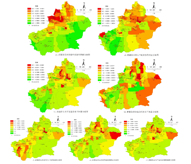 注:数据主要来源于《新疆统计年鉴2018》、新疆土地利用现状2017(变更调查统计数),难利用土地占比和少数民族人口占比为负向指标,其余为正向指标;括号中的数值为采用熵值法所确定的权重。 |