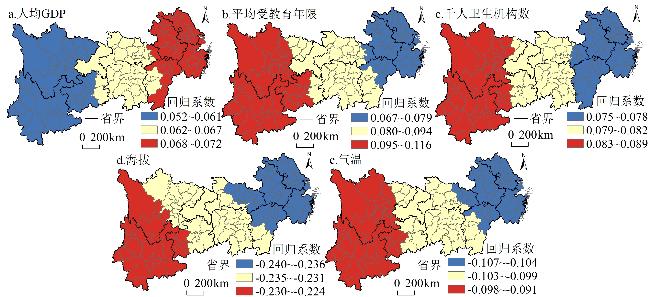 表3 长江经济带人口健康水平影响因素的地理加权回归分析结果Tab.3 Geographica weighted regression analysis of influencing factors on population health level in the Yangtze River Economic Belt |