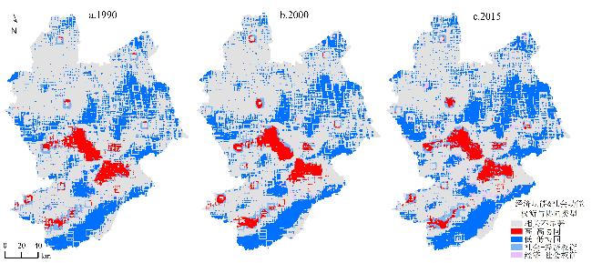 非农生产 | G23i为格网i二三产值;G23j为区县j的二三产业产值;Sj和Si分别为区县j和格网i的灯光区和城乡建设用地面积之和;Ii为格网i的平均灯光强度[18] | ||
