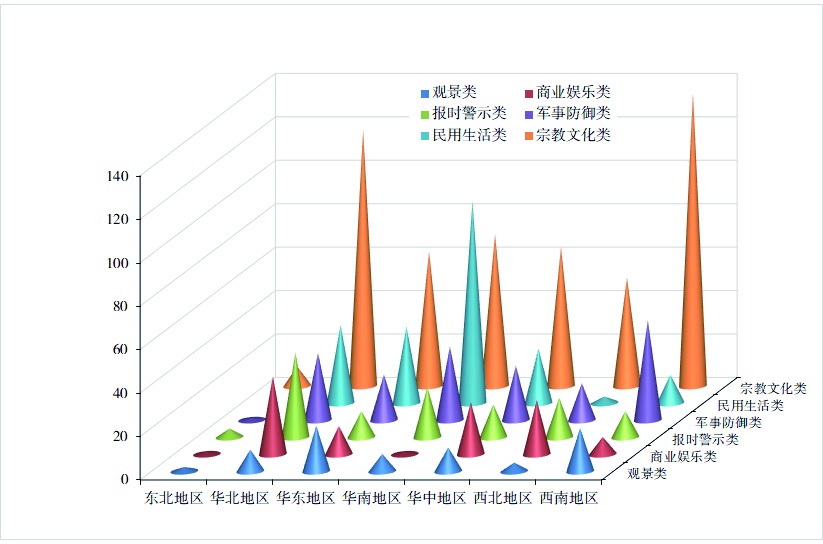 运用ArcGIS空间分析软件,对中国现存1 195座古楼的时空分布特征及影响因素进行分析,研究发现:①中国古楼的发展变迁经历了起源、成长、成熟和繁荣四个阶段。②现存古楼的数量在元朝之前波动相对平稳,呈“M”型分布特征,元朝之后波动幅度较大,呈“∧”型分布特征;总体以清朝分布最多,约占52.47%。③在空间上现存古楼为集聚型分布,且差异显著,呈“条带状与团块状并存”分布格局,主要分布在河流汇集以及地势低缓的地区;其空间分布密度层次明显,具有多中心集群分布趋势,大致呈现“东密—西疏”的格局特征;其热点区和冷点区空间差异明显,在全国区域上表现出明显的“团块状”分布特征,总体为“东南热,西北冷”。④类型上,宗教文化类分布在文化历史悠久地区,军事防御类分布在重要关隘以及人类活动频繁的地区,观景类分布在河流湖泊多的地区,商业娱乐类分布在中原地区,报时警示类则多分布在华北华南地区。⑤建筑材料上,以砖木古楼分布最多,其空间分布与材料本身的取材和性能关联性很强。⑥具有文保级别的古楼主要以中原地区、东南沿海地区以及川滇地区为核心地区。⑦相关分析得出,社会发展水平、文化发展基础、人力资源条件、旅游发展水平和政府政策导向是影响中国现存古楼分布的主要因素。