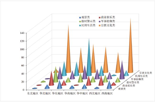 Using ArcGIS software to analyze the spatial and temporal distribution characteristics and influencing factors of 1195 existing ancient building in China, the research found that: 1) The development and change of ancient building in China experienced four stages: origin, growth, maturity and prosperity. 2) The number of existing ancient buildings fluctuated relatively stably before the Yuan Dynasty and presented the distribution characteristic of "M" type. After the Yuan Dynasty, the distribution characteristic of the existing ancient buildings was of a "∧"type. The Qing Dynasty had the largest distribution, accounting for 52.47%.3) From the perspective of space, the existing ancient buildings in China are agglomerated. The spatial difference is remarkable, and it is a pattern of "stripe and clump coexistence", and it is mainly distributed in rivers and low-lying areas; its spatial distribution density is obvious, and it has a multi-center cluster distribution trend, which is roughly dense in the east and sparse in the west; the spatial difference between the hot spot and the cold spot is significant, and it shows obvious "clustered" distribution characteristics in the whole country, and the overall is "southeast heat, northwest cold". 4) From the perspective of types, the ancient buildings of religious culture are distributed in areas with long cultural history; the type of military defenses are distributed in important passes and areas where human activities are frequent; the ancient building for viewing are distributed in areas with many rivers and lakes; the type of commercial entertainment are distributed in the Central Plains; the ancient building used for time warning are mostly distributed in North China and South China. 5) From the perspective of building materials, brick and wood ancient buildings are the most widely distributed. The spatial distribution is strongly related to the material's selection and performance. 6)The ancient buildings with the level of cultural relics protection mainly take the Central Plains area, southeast coastal area and Sichuan-Yunnan area as the core areas. 7)Relevant analysis concluded that, social development level, cultural development foundation, human resource conditions, tourism development level and government policy orientation are the main factors that affect the distribution of existing ancient buildings in China.