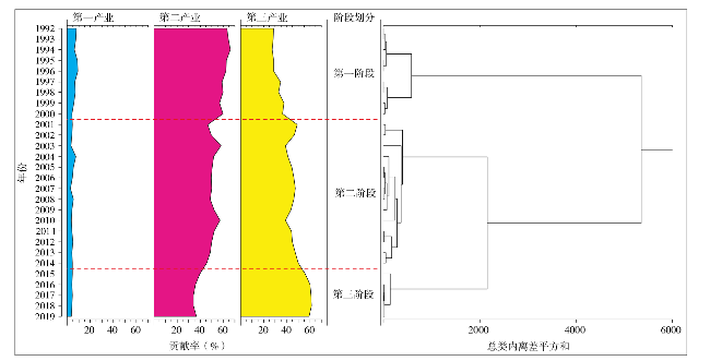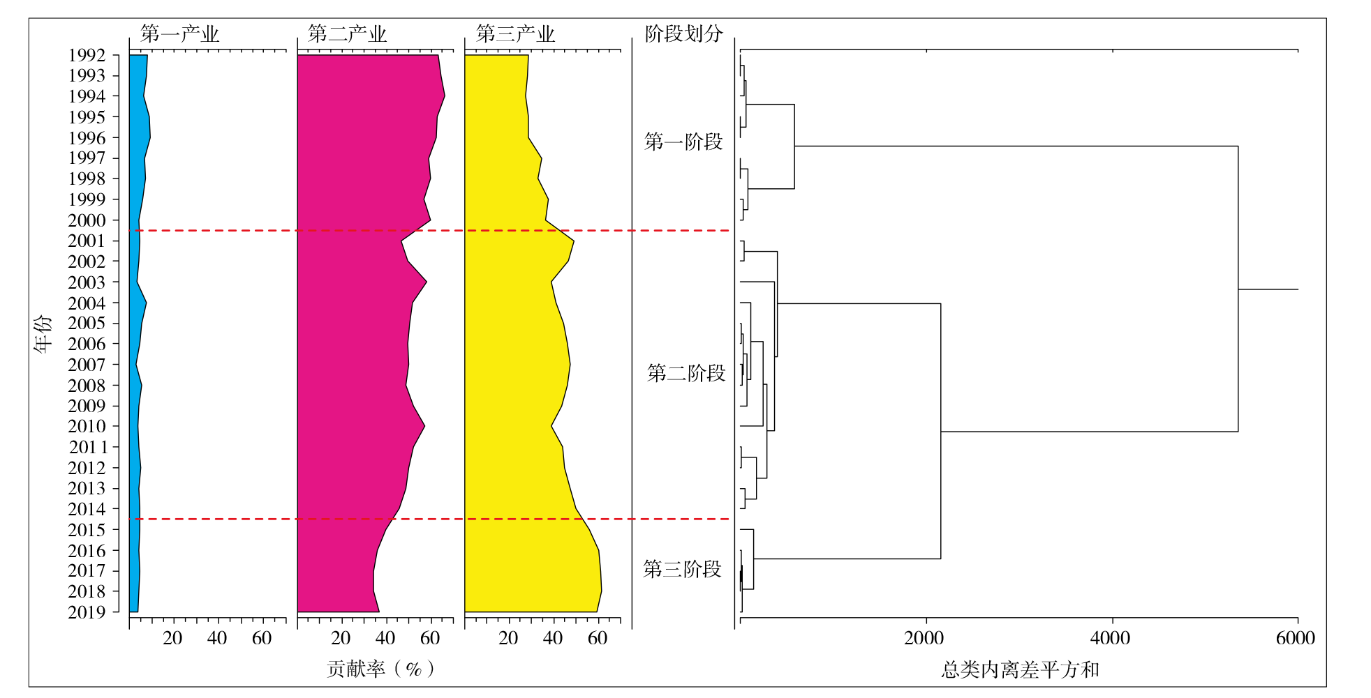 结构主义视角 | 年度三产结构指标 | 时间约束聚类 | 第一阶段(1992—2000年) 第二阶段(2001—2014年) 第三阶段(2015—2019年) |