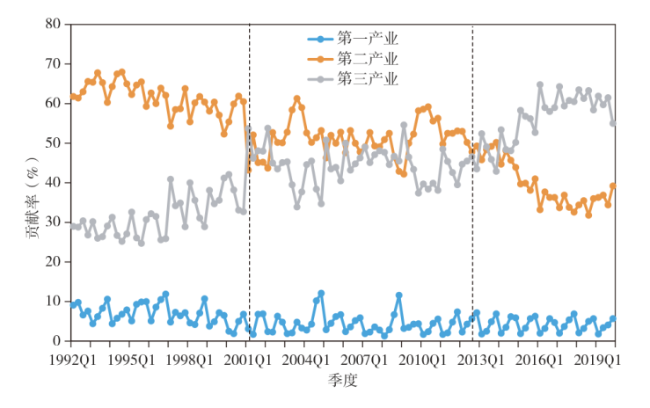 季度三产结构指标 | 多元断点分析 | 第一阶段(1992Q1—2000Q4) 第二阶段(2001Q1—2012Q3) 第三阶段(2012Q4—2019Q4) | |