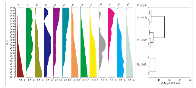 图4 1992—2018年中国经济发展阶段综合划分Fig.4 Division of China's economic development stages from 1992 to 2018 |