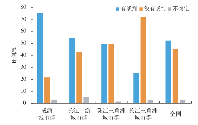 城市群 | 城市 | 样本/户 | 有谈判(比例/%) | 没有谈判(比例/%) | 不确定(比例/%) |
