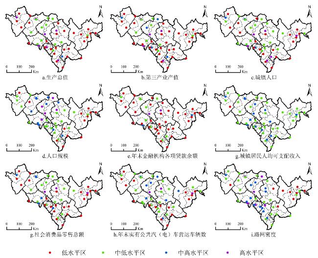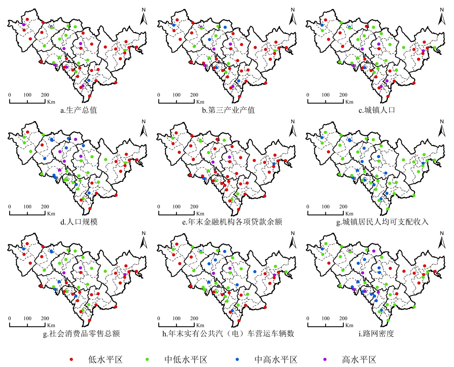 图5 吉林省城镇中心性影响因子空间分布图Fig.5 The spatial distribution of influencing factors of urban centrality in Jilin Province |