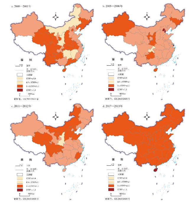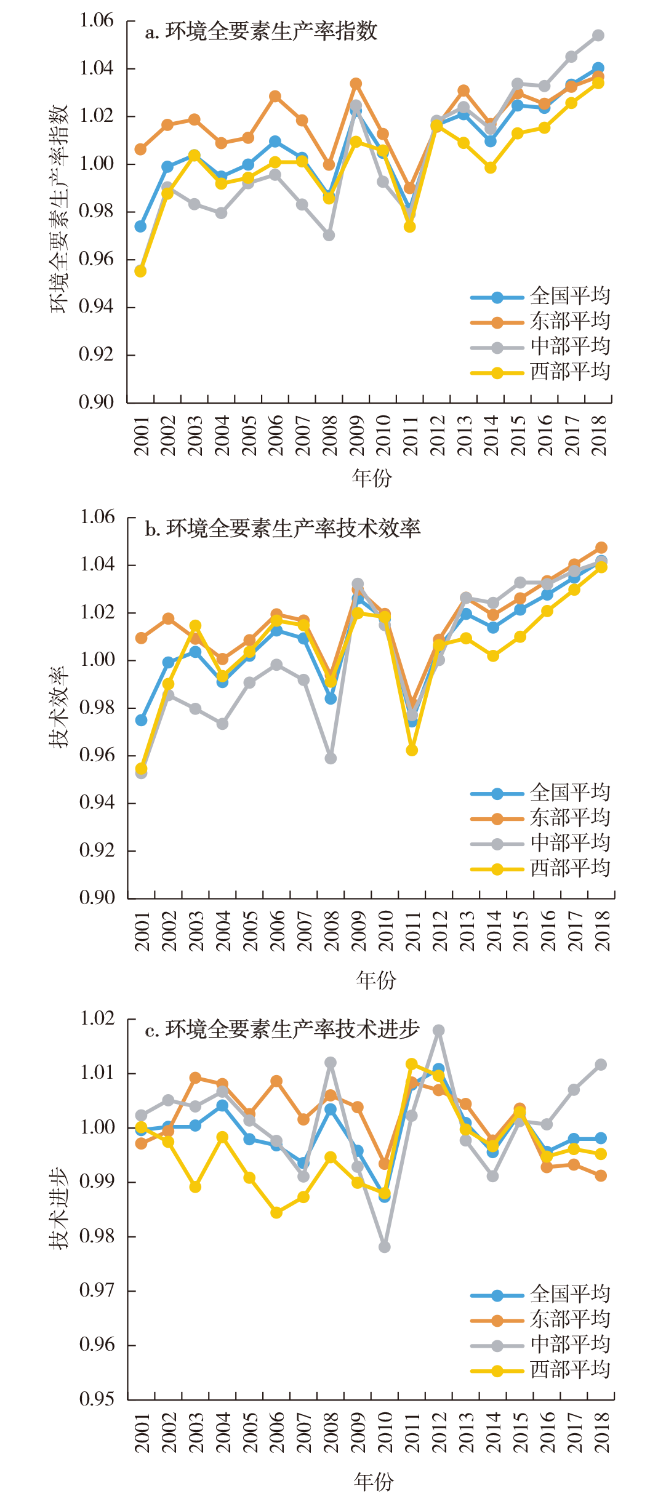 表1 2001—2018年中国省级环境全要素生产率指数及其分解Tab.1 Environmental Total Factor Productivity Index and its decomposition in China from 2001 to 2018 |