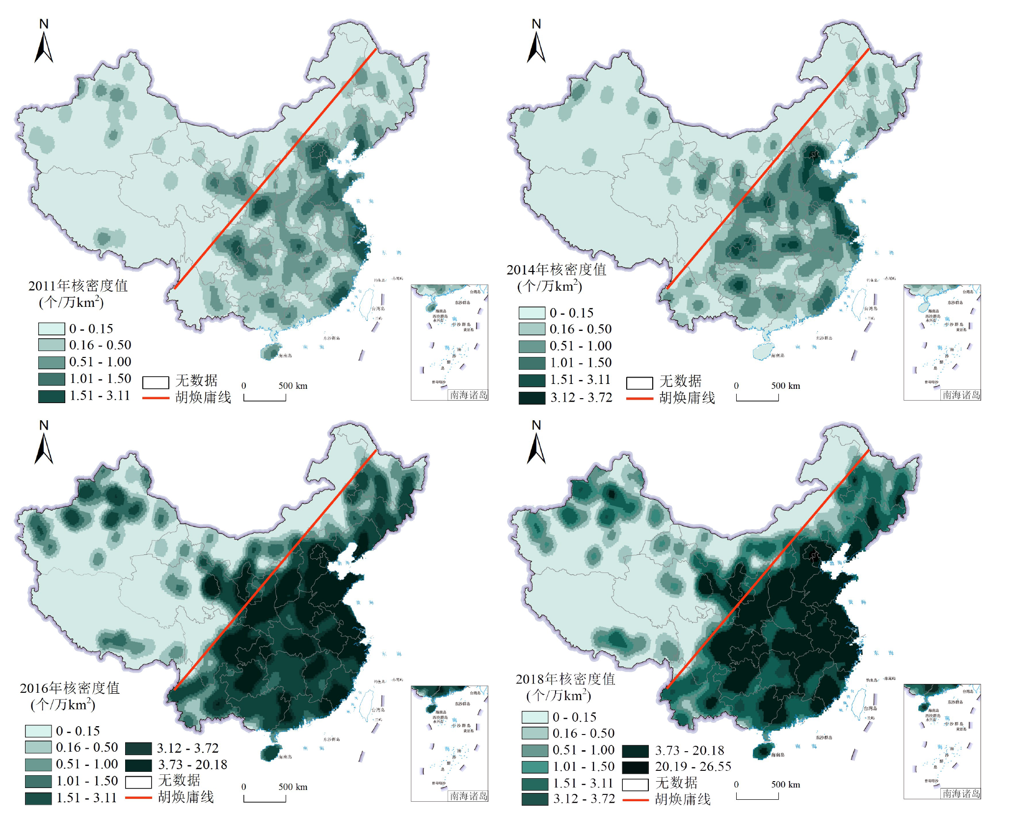 河流缓冲距离(km) | 0~2.5 | 1 143 583 | 44 | 201 | 317 | 438 | 0.000038 | 0.000176 | 0.000277 | 0.000383 | |