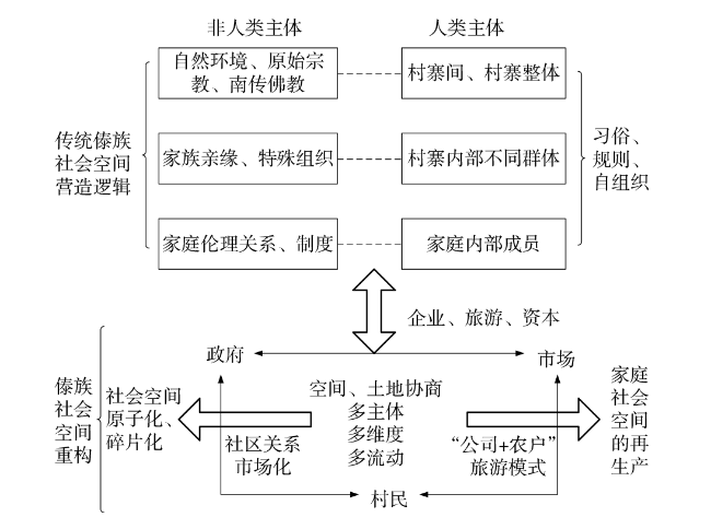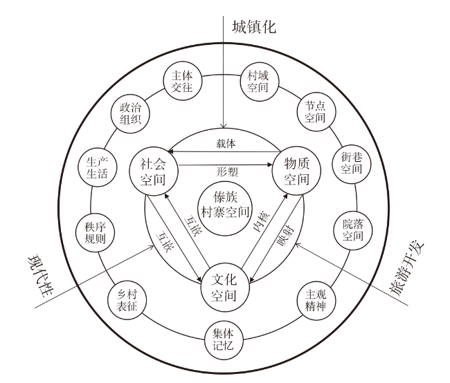 快速城镇化进程中我国乡村的社会、经济发展面临着剧烈的转型,乡村空间正历经着前所未有的重构。傣族村寨是兼具文化性、社会性与地方性的有机空间系统,在现代性的影响下逐渐从封闭、稳定和同质走向了开放、动态和多元。文章尝试从不同维度来解析傣族村寨的物质、社会、文化空间的形成机理以及其在现代性的综合作用下的互动与变化机理,研究发现:①原始宗教和佛教双重信仰体系下形成的傣族文化观、空间观组成了严密的社会文化逻辑,界定了傣族村寨的整体空间形态与边界范围,并形塑了傣族村寨的街巷、院落空间与民居形态。②宗教组织、家族亲缘、家庭血缘与非正式组织是维系傣族村寨社会空间形态的四个层次,而现代性加速了社会空间中各层次之间要素的置换与流动,导致傣族村寨的乡土社会与空间呈现出原子化、碎片化的状态。③传统傣族以个体“在场”的形式在族内、族间展开精神、记忆的交流,从而建构了传统的村寨文化空间,而新兴的信息传播方式将城市文化等引入到傣族传统文化空间,使得傣族村寨的文化空间发生了延展。