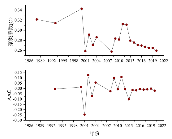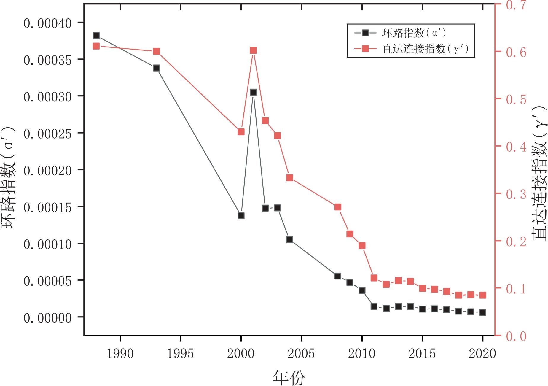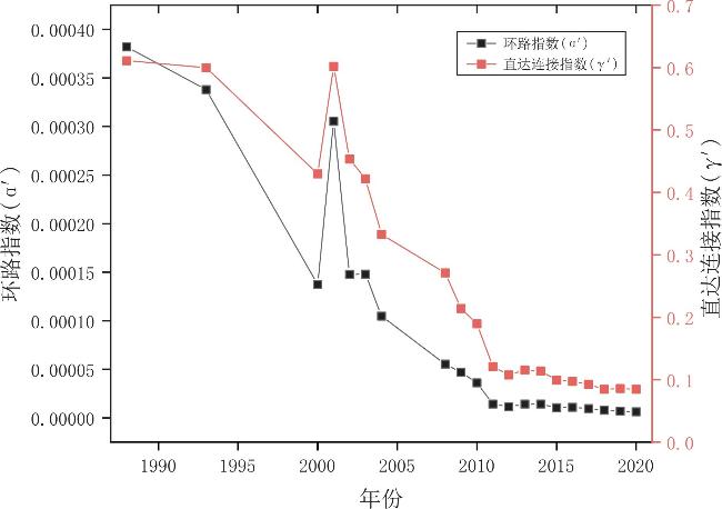 表1 1988—2020年北京地铁网络线路度分布与K-S检验结果Tab.1 Degree distribution and K-S test of Beijing subway network from 1988 to 2020 |