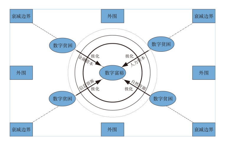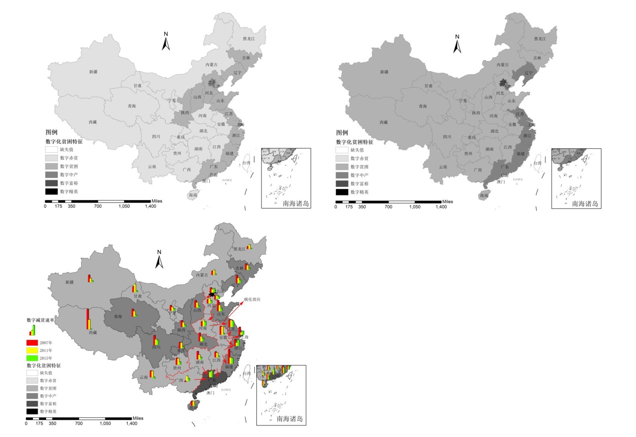 数字化贫困是我国现阶段呈现的一种新形态的贫困。文章基于数字平台、数字能力、数字行政、数字生活四个方面构建地区数字化贫困指标体系,测度了我国31省市区2006—2015年数字化贫困指数,并剖析其时间和空间层面的演变及原因。进一步,运用基于邻接、地理距离、人力资本距离和距离衰减空间权重的空间杜宾模型进行了实证研究,研究结果表明:①我国数字化贫困减贫呈现两阶段特征;②数字化整体呈现由赤贫向精英阶层动态演进的社会移动,地理上呈现由东向西的“贪吃蛇”式推进特征,并且在地理上呈现一条南北贯穿的“数字化鸿沟”;③数字富裕地区对数字贫困地区的“空间极化效应”可能的衰减边界为160~200 km。最后,提出了相关政策建议。