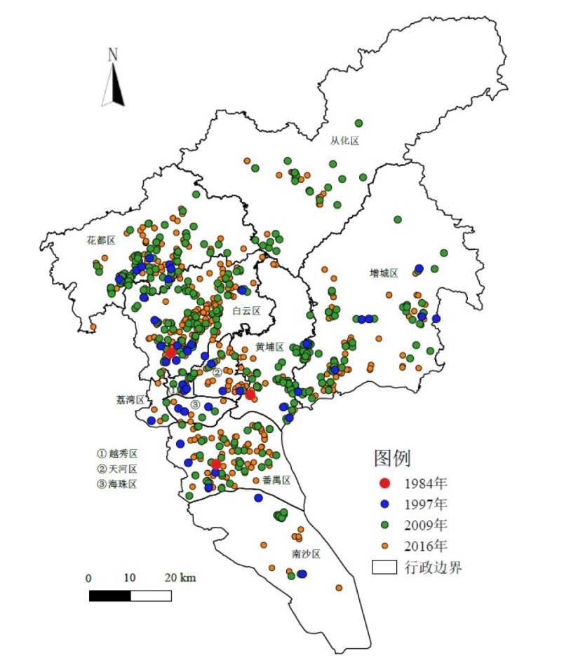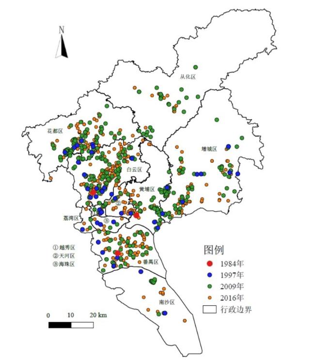 表1 1997—2016年广州各区汽车制造业企业数量Tab.1 Number of automobile manufacturing enterprises in Guangzhou in 1997-2016 |