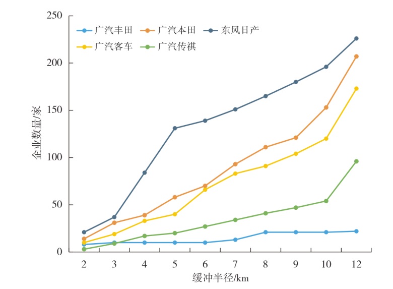 注:以整车企业为对象采用QGIS软件进行缓冲分析,计算不同缓冲区内汽车零部件企业数量及占比情况。 |