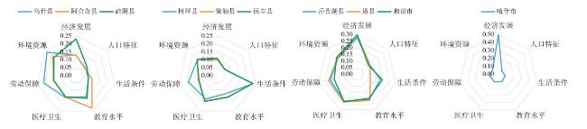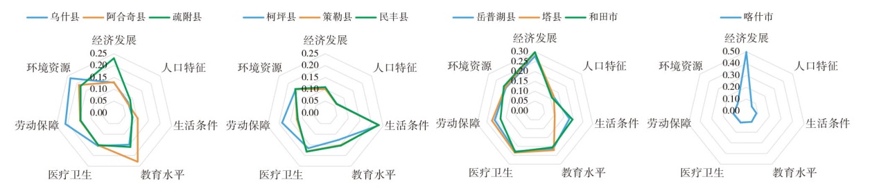 图9 4类贫困县多维贫困贡献度雷达图Fig.9 Radar map of the multidimensional poverty contribution degree in four kinds of poverty-stricken counties |
