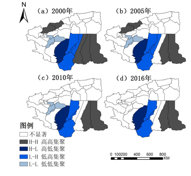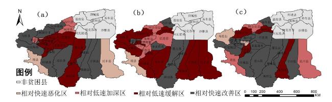 图3 南疆四地州贫困县经济贫困指数空间格局演变Fig.3 The spatial pattern evolution of economic poverty index in poor counties of the four prefectures in South Xinjiang in 2000-2005,2006-2010 and 2011-2016 |