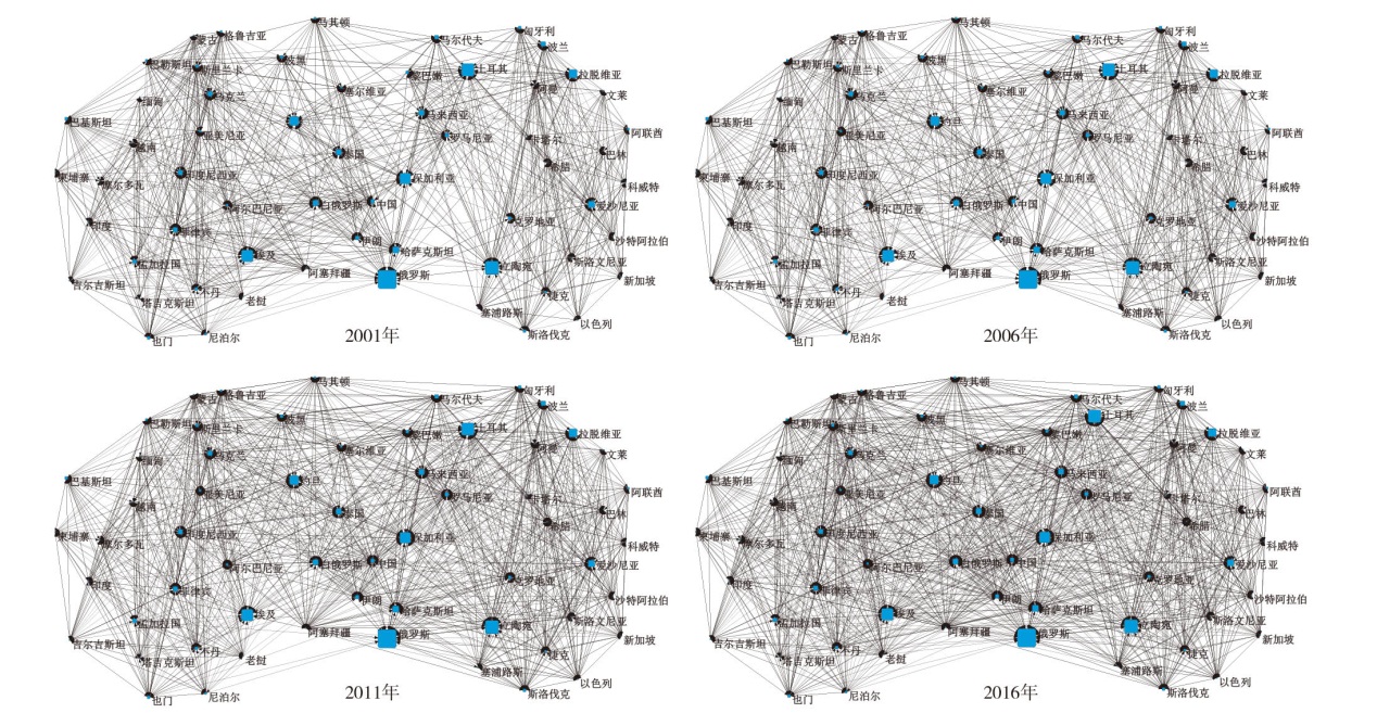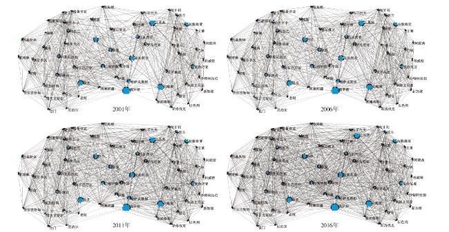 表1 “一带一路”沿线国家区域旅游合作结构情况与网络密度Tab.1 Tourism cooperation network & network density of regions along the Belt and Road Initiative in 2001,2006,2011 and 2016 |