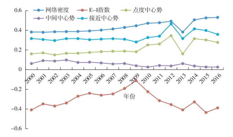 年份 | 度数中心度 | 接近中心度 | 中间中心度 | 合作地位指数 | |||||||||||