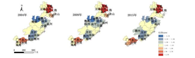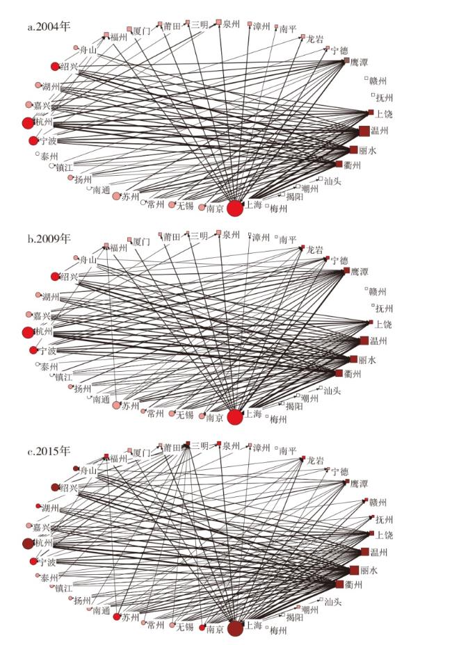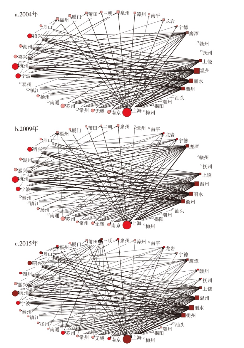 图1 2004—2015年海峡西岸城市群与长三角城市群的经济网络演化Fig.1 Economic networks of urban agglomerations between the West Coast of Taiwan Straits and Yangtze River Delta from 2004 to 2015 |