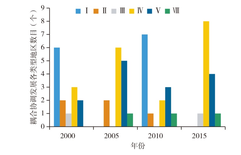 图4 新型城镇化建设与金融支持耦合协调发展类型频率统计Fig.4 Status of coupling coordination development types between new urbanization construction and financial support |