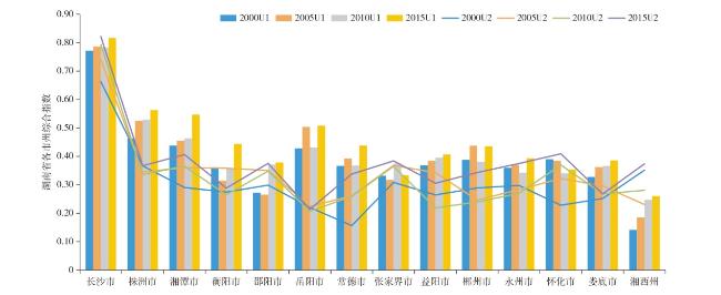 湘潭 | 0.4222 | 0.6631 | Ⅳ | 0.4500 | 0.7921 | Ⅳ | 0.4537 | 0.7892 | Ⅳ | 0.4855 | 0.7425 | Ⅳ | |||